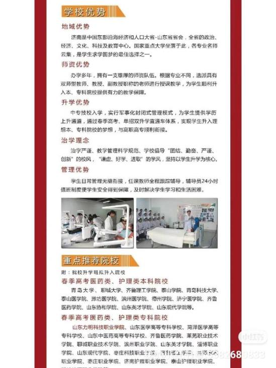 学校主要开设医药类、护理类专业升学班,春考升学专业主要涵盖护理、助产、临床医学、口腔医学、中医学、针灸推拿、药学、中药学、医学检验技术、医学影像技术、康复治疗技术等十余个医护类专业。