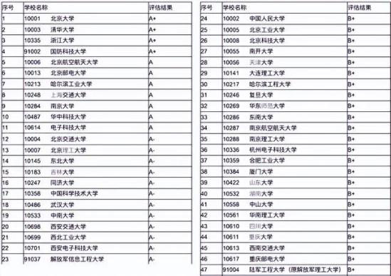 这是国内计算机科学与技术学科获评B 类及以上的大学,共有47所。其中北大、清华、浙大、国防科大4校获评A ,可以说是国内计算机类专业整体水平最高的大学,而且4校都是国内的顶尖名校,就业优势非常好。