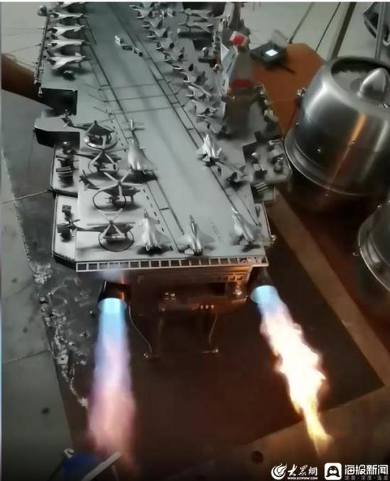 “遇到了想放弃的瓶颈,我就先搁置一段时间,然后再努力琢磨解决的办法。”最终,他想到了用不锈钢锅的方式,“我买了四个不锈钢锅,然后买了个抽油烟机,把抽油烟的那个轮子放在锅盖上,就像飞机的发动机引擎一样,一边放两个,一共四个。”这样既美观,又能增加浮力,让航母顺利实现下水。