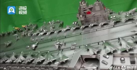 任百林介绍,整套航母基本按照和真正的航母1:200的比例制作,总重量200多斤,耗时三年,花费了两三万元。如今,这套航母被当做教学模型,来参观和学习的学生们通过这个模型,了解我国航母的真实情况。