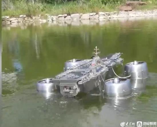 任百林手工制作的航空母舰模型能实现下水,一边两个圆柱状装置,是用高压锅和抽油烟机排气扇制作,用来增加浮力。
