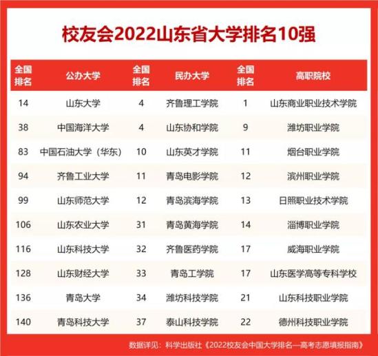 齐鲁理工学院、山东协和学院雄居2022山东省民办大学排名冠军,青岛电影学院跻身前3强
