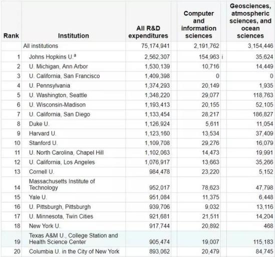 美国国家科学基金会的 2017 年研发财政研发支出统计中,德州农工在全美的研究型大学中排第 19 为,年度支出为 9.054 亿美元,高于哥伦比亚大学。