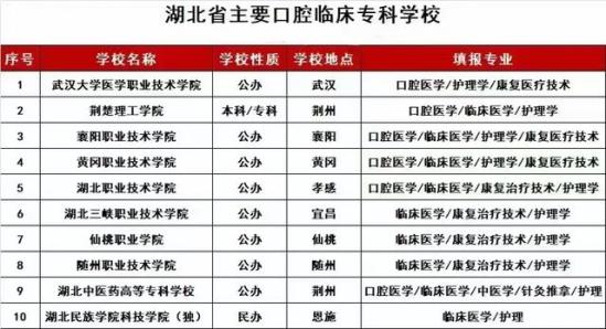 1.湖北省教育大省:相较于其他省份医学专科学校多,口腔医学专科学校7所,临床医学11所,并且都是公办全日制学校,公办院校毕业后全国范围可以参加执业助理医师和执业医师考试。