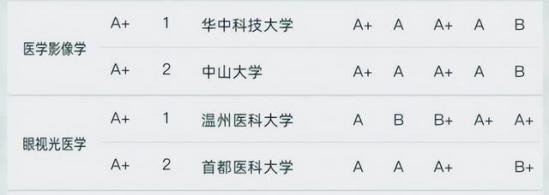 医学影像学的强势院校也有中山一个,另一个也是四大天王之一的华中科技大学同济医学院。眼视光医学强势的两所大学分别是温州医科大和首都医科大,两个都是近年的热门专业。