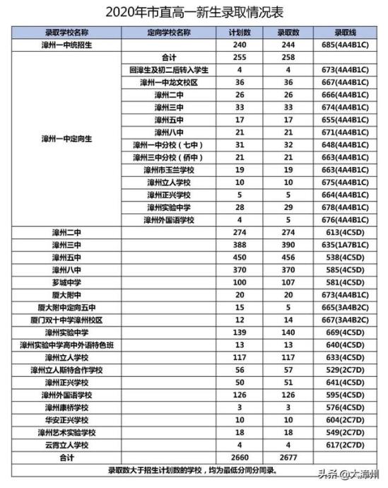2020年漳州市普通高中全部实行网上填报志愿,网上录取。2020年漳州市普通高中新高一的统招批录取分数线情况如下:
