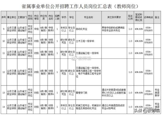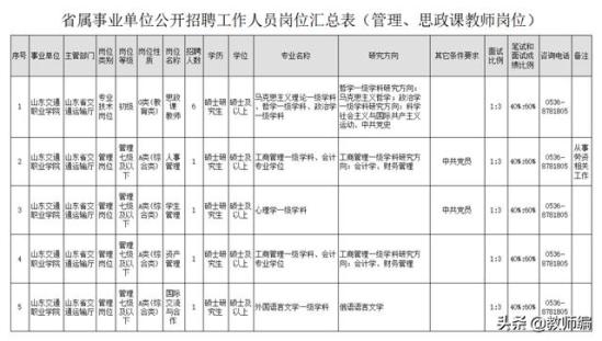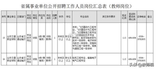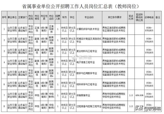 根据省委组织部、省人力资源社会保障厅《关于印发2021年度省属事业单位公开招聘工作实施方案的通知》(鲁人社发〔2021〕7号)及《关于做好 2021年事业单位公开招聘工作人员有关问题的通知》(鲁人社字〔2020〕155号)文件要求,结合工作需要,山东交通职业学院拟面向社会公开招聘工作人员26人,其中,正高级岗位1人、副高级岗位5人、中级岗位3人、初级岗位13人、管理岗位4人。具体岗位及条件详见《省属事业单位公开招聘工作人员岗位汇总表》。