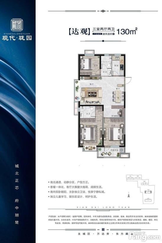 建面约130㎡三室两厅两卫分布在5#楼端户,户型方正,餐客相连,客厅大飘窗大格局,奢享阔朗生活;南向双卧朝阳,主卧设置独立卫浴,悦享宁静私域;独立儿童学习、娱乐区设计,呵护生活。