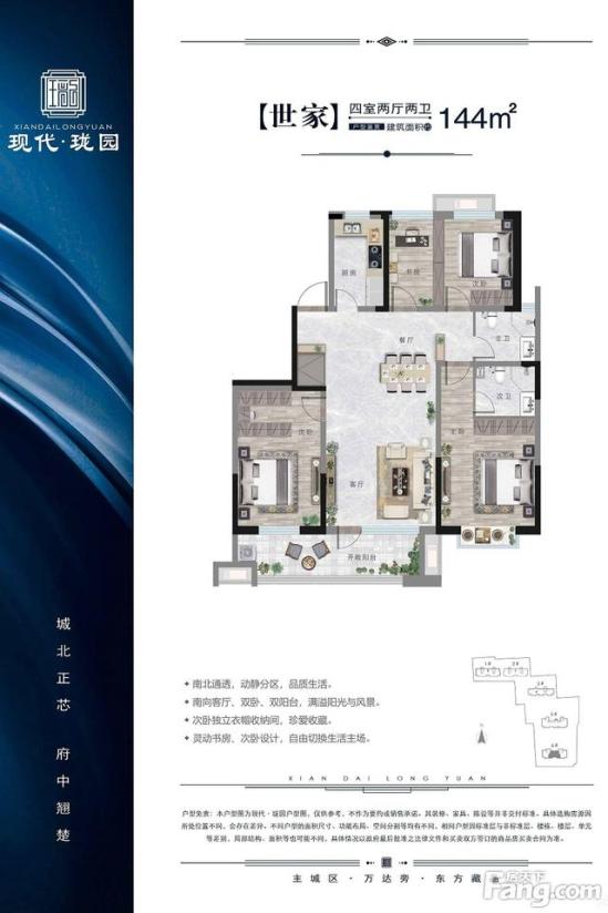 建面约144㎡四室两厅两卫户型分布在6#楼,南向客厅、双卧、双阳台,满溢阳光与风景;次卧独立衣帽收纳间,珍爱收藏;灵动书房、次卧设计,自由切换生活主场。