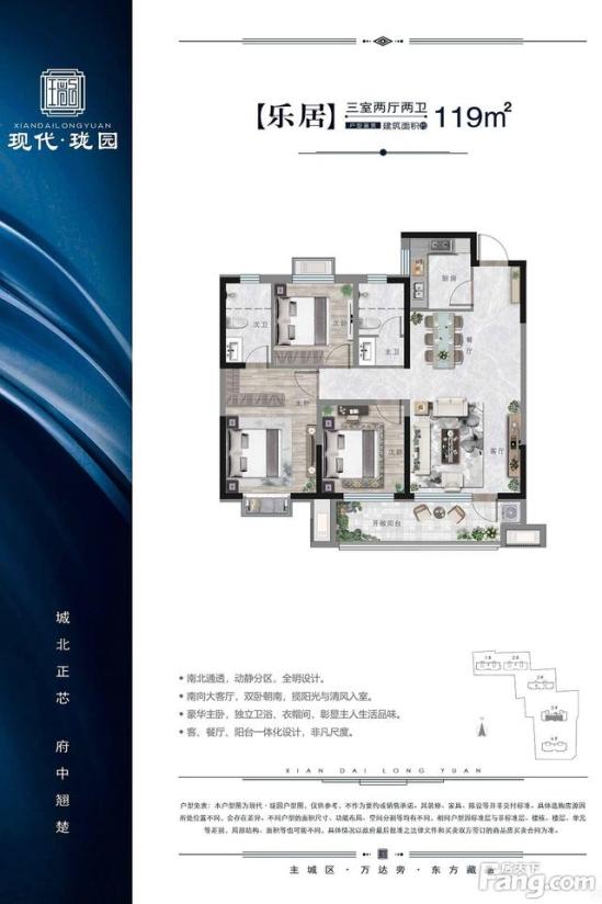 建面约119㎡三室两厅两卫户型分布在5#楼,南北通透,动静分区,全明设计;南向大客厅,双卧朝南,揽阳光与清风入室;豪华主卧,独立卫浴、衣帽间,彰显主人生活品味;客、餐厅、阳台一体化设计,尽显非凡尺度。