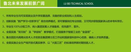 鲁北技工学校以“为鲁北企业集团总公司培养技能人才为使命服务于山东鲁北高新技术开发区经济发展,为鲁北区域经济建设培养高素质、实用型、技能型人才”为目标,学生毕业时由鲁北企业集团总公司人力资源部按照学生个人意愿和所学专业进行分配己上岗,全部实现高质量“订单式”人才培养