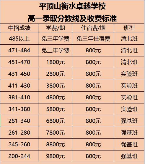 2022年衡水中学高中录取分数线和收费标准公布平顶山衡水中学是近年才在平顶山市建立的新中学,属于盈利性学校,学校位于河南省宝丰县,住宿费800元/学期(485分以上全免),学费根据中考成绩有所不同,471分以上的免三年,成绩低的最高学费是9800/学期。