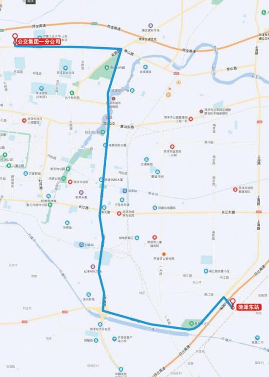 线路走向:火车站—桂陵路—长江路—武汉路—钱江路—上海路—规划路—菏泽东站