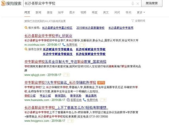 6月17日上午10时许,记者以“长沙县职业中专学校”为例,在搜狗搜索输入关键字“长沙县职业中专学校”或“长沙县职业中专”,网页搜索结果第一位的搜索结果是“长沙县职业中专学校学it_好就业”,在标题右下方小字模糊显示“广告”二字,点击进去则为“长沙新华电脑学院”网站及招生信息。相关法律人士认为此行为均涉侵权。