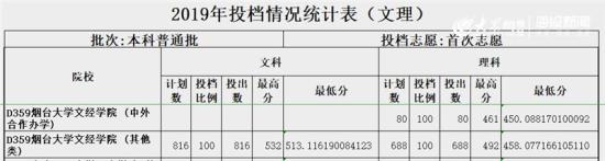 烟台大学文经学院(其他类)投档分数:文科最高分532分,文科最低分513.116190084123分;理科最高分492分,理科最低分458.077166105110分。