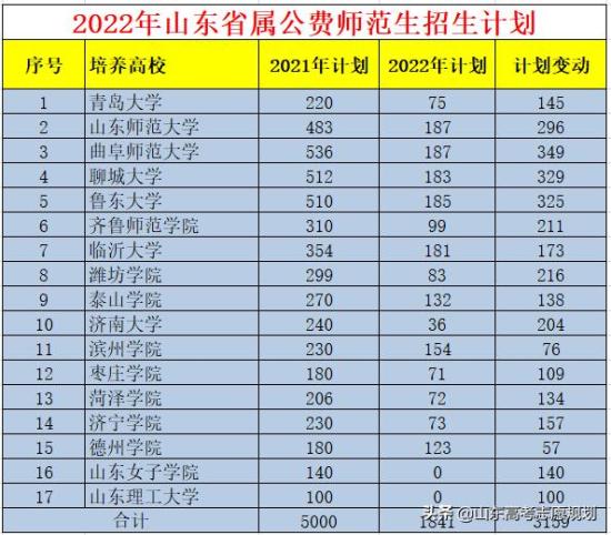 二、山东公费师范生近两年高校培养计划变动情况见下表: