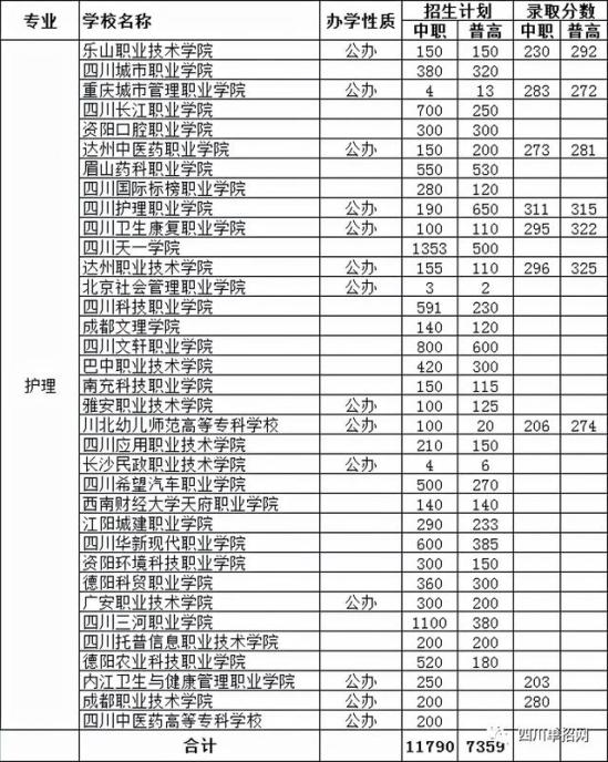 2021年四川单招,护理专业总计招生19149人,这里面包含中职11790人,普通类学生7359人。总共有35所学校,其中有三所学校护理专业只招收中职学生,分别是内江卫生与健康管理职业学院、成都职业技术学院和四川中医药高等专科学校。