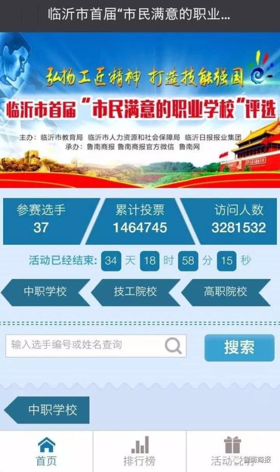 本着公平、公正的评选标准,本次评选活动中,驻临37家高职院校、技工院校和高职院校全部参评,在微信投票页面,共累计投票146.4万票,访问人数327.9万次,创造评选访问记录新高。在微信投票的同时结合市民问卷调查投票,最终临沂市职业学院、临沂市工业学校、临沂市农业学校等学校位居投票榜前列。