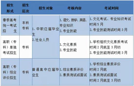 答:我省春季高考招生包括春季高考统一考试招生、高职(专科)单独考试招生和高职(专科)综合评价招生三种类型。各类考试招生对象、考核内容、考试时间请参照下表。