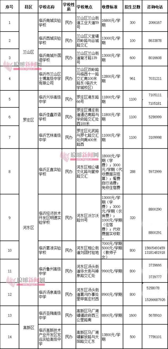 城区民办普通高中关键信息其中包括兰山区、罗庄区