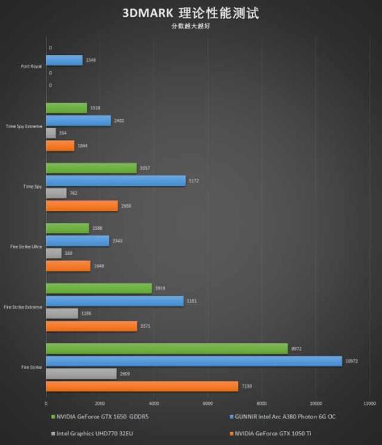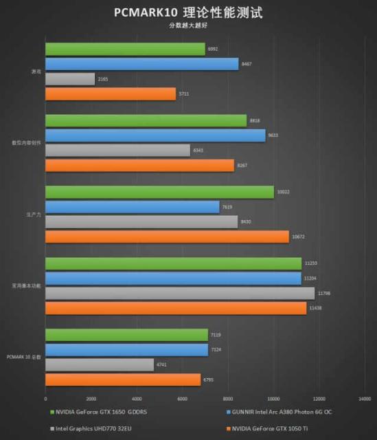 从数据来说,英特尔锐炫A380是四款显卡PCMARK10分数最高的,与GTX1650总分是同一个水平线上。从细项分数来说,英特尔锐炫A380生产力项目上有些落后了,不然总分估计是领先更多,尤其是数位内容创作和游戏这两项目上英特尔锐炫A380明显有着更高的性能表现,所以笔者怀疑目前这一版本的驱动对部分应用软件兼容优化不太理想有关,以至于英特尔锐炫A380未能发挥出正常水平。