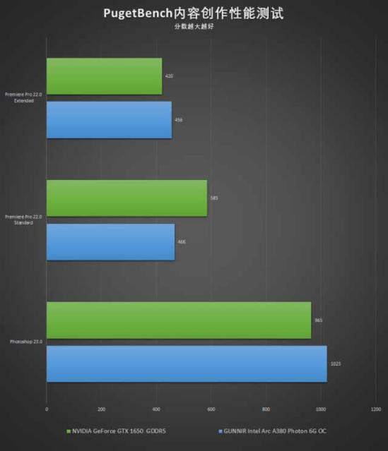 同样我们利用PugetBench提供的测试文件进行实质的PSPR性能测试,可看到,PugetBench测试程度中,PS是没有问题的,且英特尔锐炫A380显卡跑分比GTX1650要高不少;而PR测试中,4K视频(Standard)的处理英特尔锐炫A380显卡又落后一些,但是8视频(Extended)分数却高不少,这样来看,英特尔锐炫A380显卡在复杂和大工程的视频文件中有着更好的性能优势。