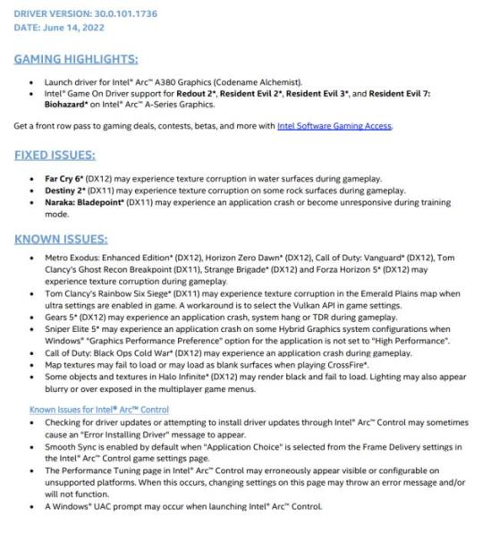 从驱动的说明文档里发现,游戏中已知的问题虽然都是小问题,但也希望英特尔在之后的驱动继续积极优化。