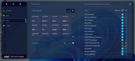而性能监控器则是可以看到英特尔锐炫显卡各组件的运行情况,包括GPU频率、温度、电压、VRAM温度、风扇转速,以及渲染器利用率等。而遥测叠加则是OSD界面,直接可以让用户看到显卡各部件的状态。