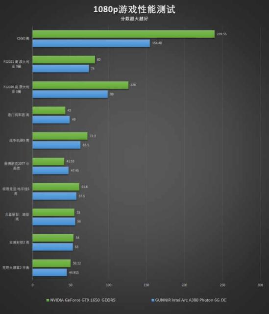 游戏测试方面,我们只使用了英特尔锐炫A380与GTX1650两组数据直接让大家来看看主流级游戏显卡在1080p大型3A游戏下的性能表现。从目前的性能来看,英特尔锐炫A380在游戏中有着4%左右性能落后于GTX1650,当然笔者认为这显卡毕竟是新产品,驱动、游戏兼容、性能优化仍未达到竞品那样的成熟,所以目前这个数据只能说是此前此款产品配合这驱动的初步性能表现。