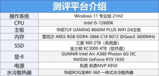 基于英特尔锐炫A380显卡是定位于主流级用户,所以送测机器同样是主流级的配置:i5-12600K TUFB660MD4主板 DDR4高频内存条,而硬盘则是来自评测室里的系统盘与资料盘,电源和水冷笔者直接更换成更高规格的配件。