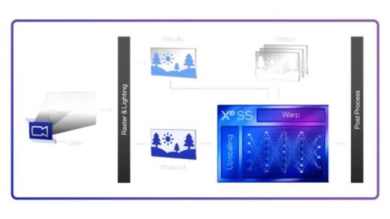 英特尔Xe超级采样技术(XeSS),一种利用AI智能强化升级提高性能和图像保真度的技术,此项技术主要是针对游戏体验,通过学习相邻像素以及运动补偿先前帧重建子像素细节,合成非常接近于原生超高分辨率渲染质量的图像,提高游戏输出分辨率,从而达到更好的游戏体验。其实这技术与老黄家的DLSS、苏姨家的FSR相类似,同样是实现最高性能的同时提供更保真的画面。